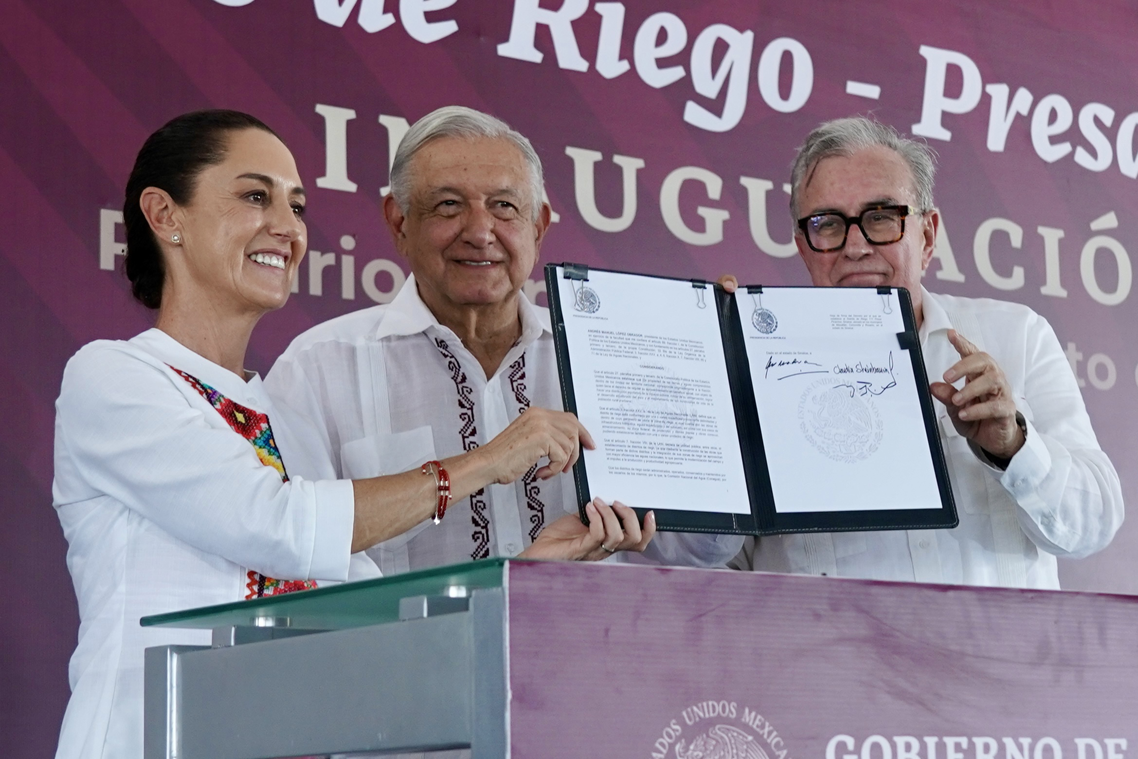 Durante la ceremonia, junto a Sheinbaum y el gobernador Rubén Rocha Moya, firmaron el decreto que establece el distrito de riego y presenciaron la apertura de uno de los hidrantes del sistema.